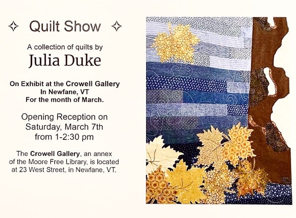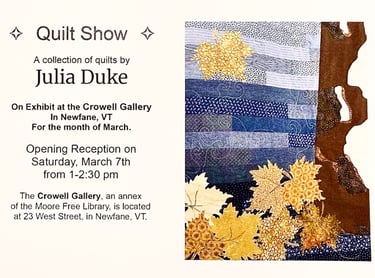 JULIA'S QUILTS WILL BE ON DISPLAY AT THE CROWELL GALLERY IN NEWFANE VT during the month of march.